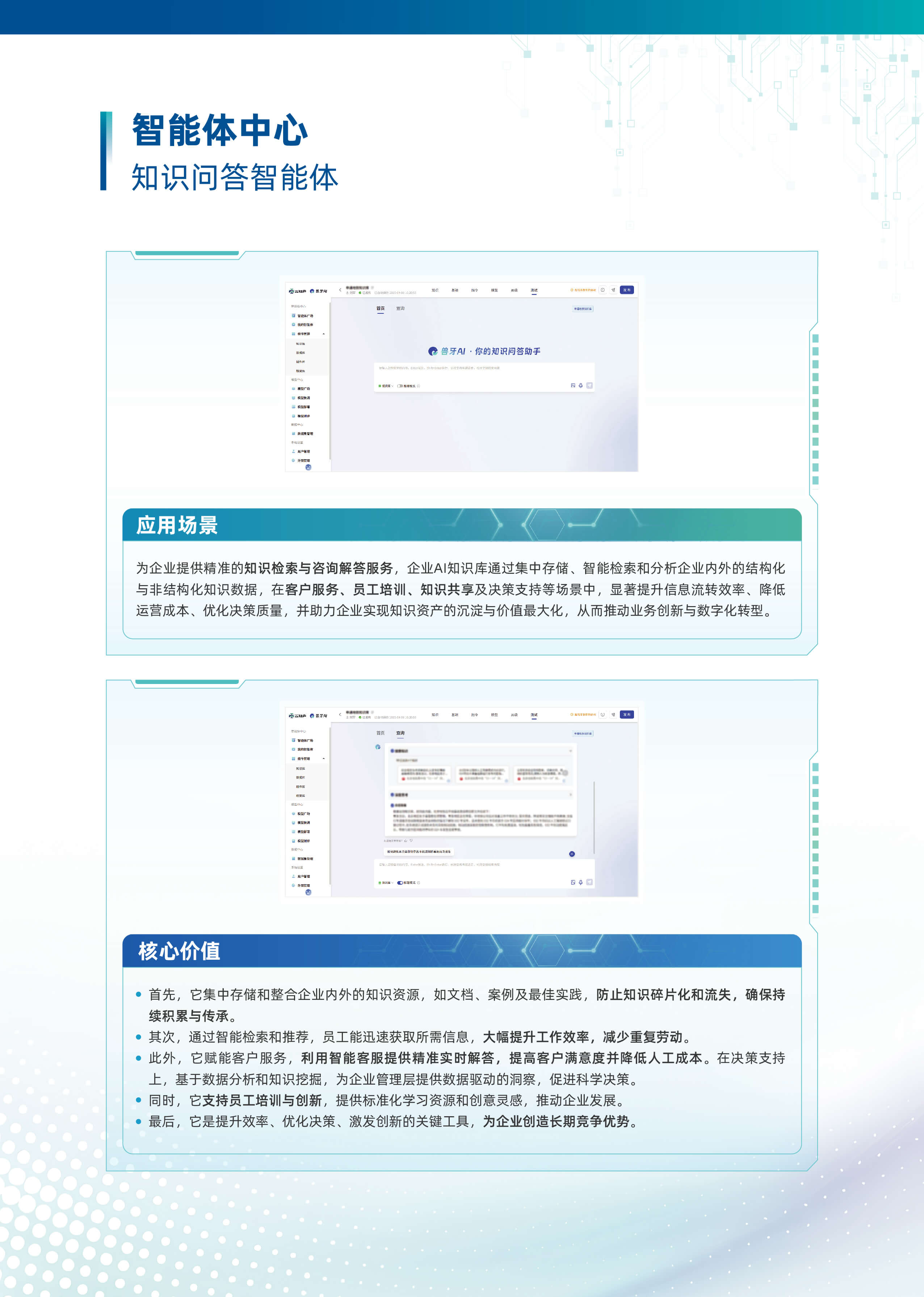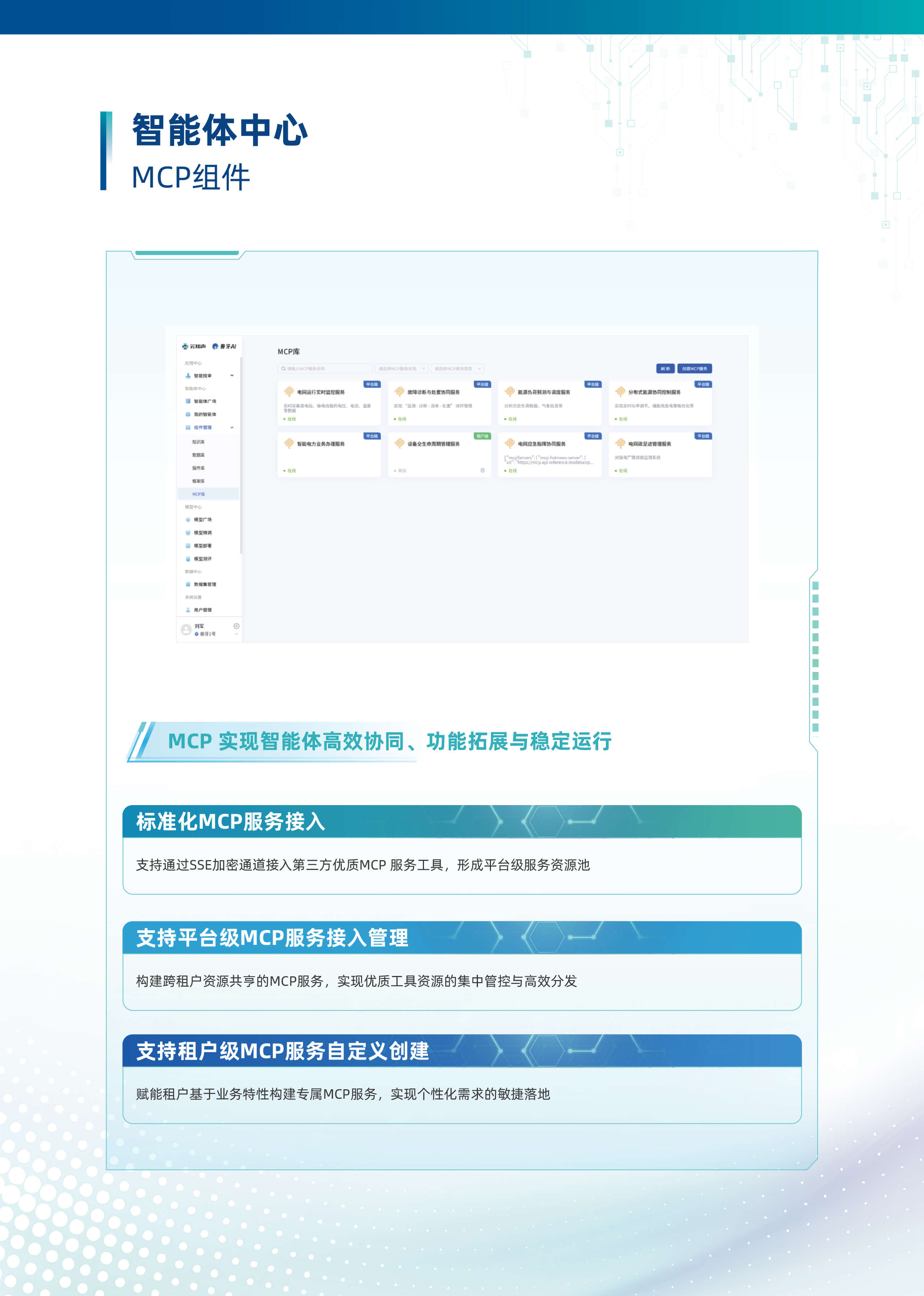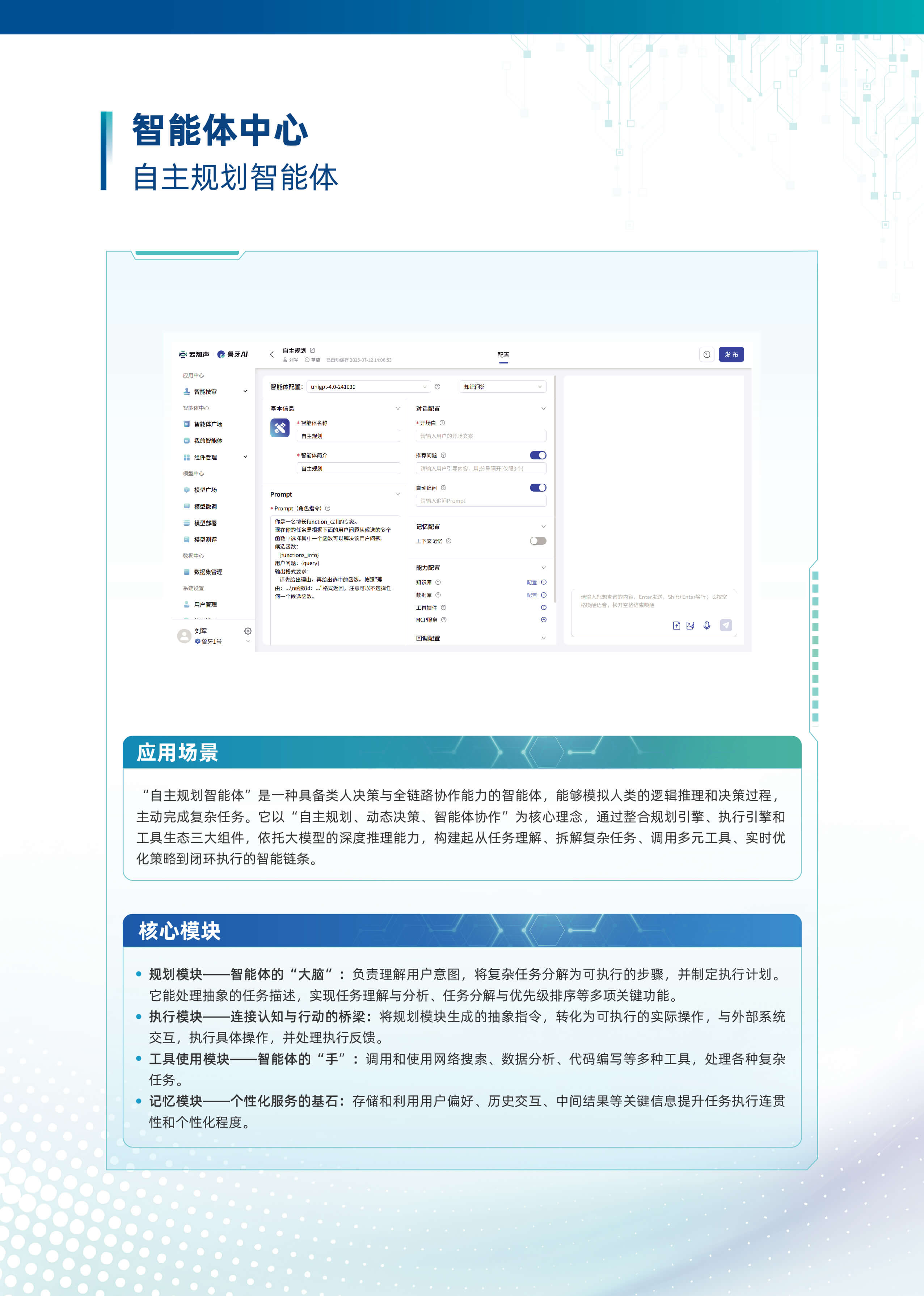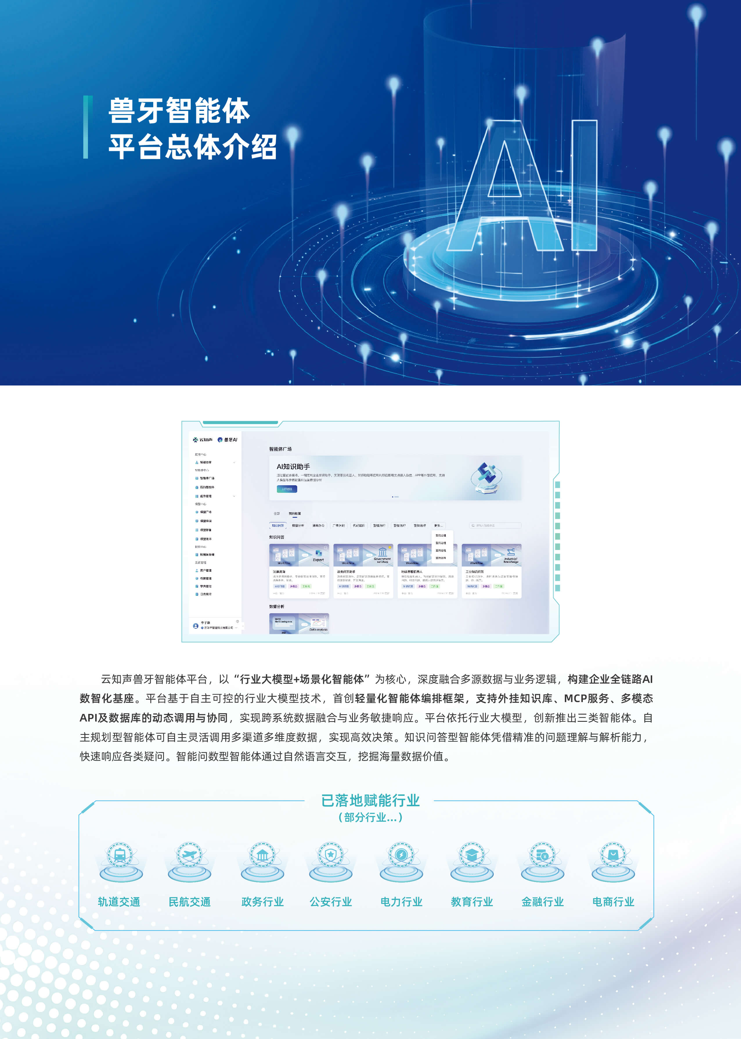 以“行业大模型+场景化智能体”为核心,深度融合多源数据与业务逻辑,构建企业全链路AI数智化基座。平台基于自主可控的行业大模型技术,首创轻量化智能体编排框架,支持外挂知识库、MCP服务、多模态API及数据库的动态调用与协同,实现跨系统数据融合与业务敏捷响应。平台依托行业大模型,创新推出三类智能体。自主规划型智能体可自主灵活调用多渠道多维度数据,实现高效决策。知识问答型智能体凭借精准的问题理解与解析能力,快速响应各类疑问。智能问数型智能体通过自然语言交互,挖掘海量数据价值。