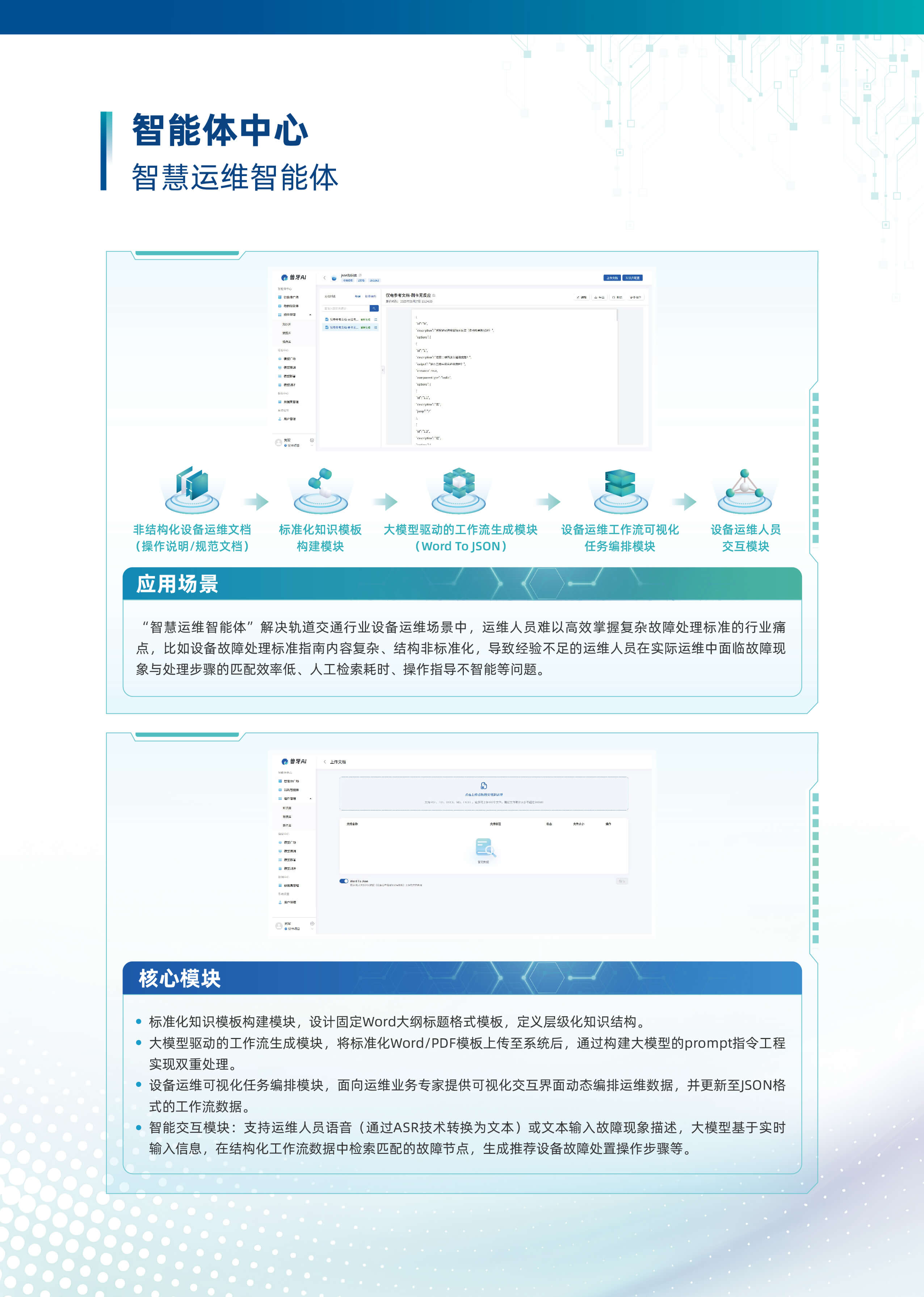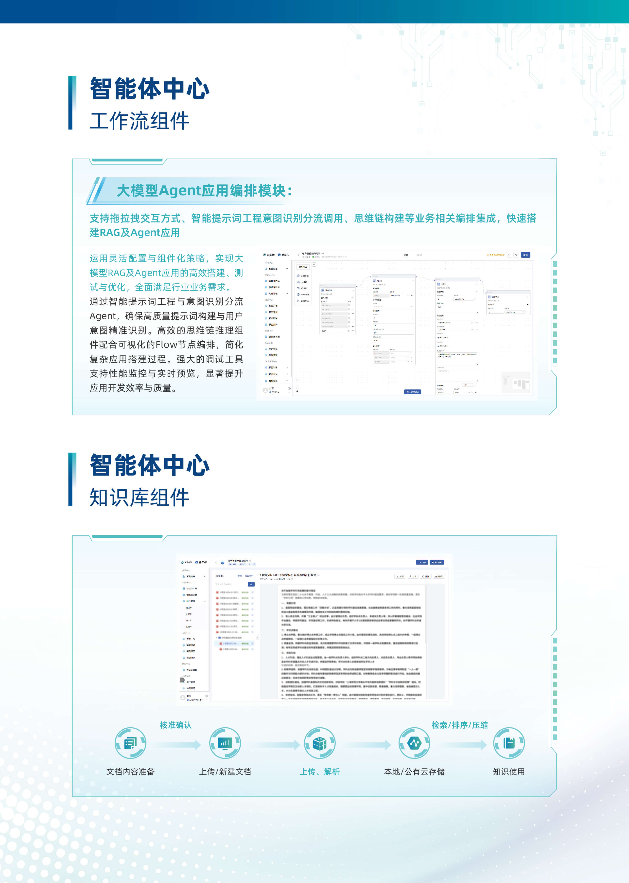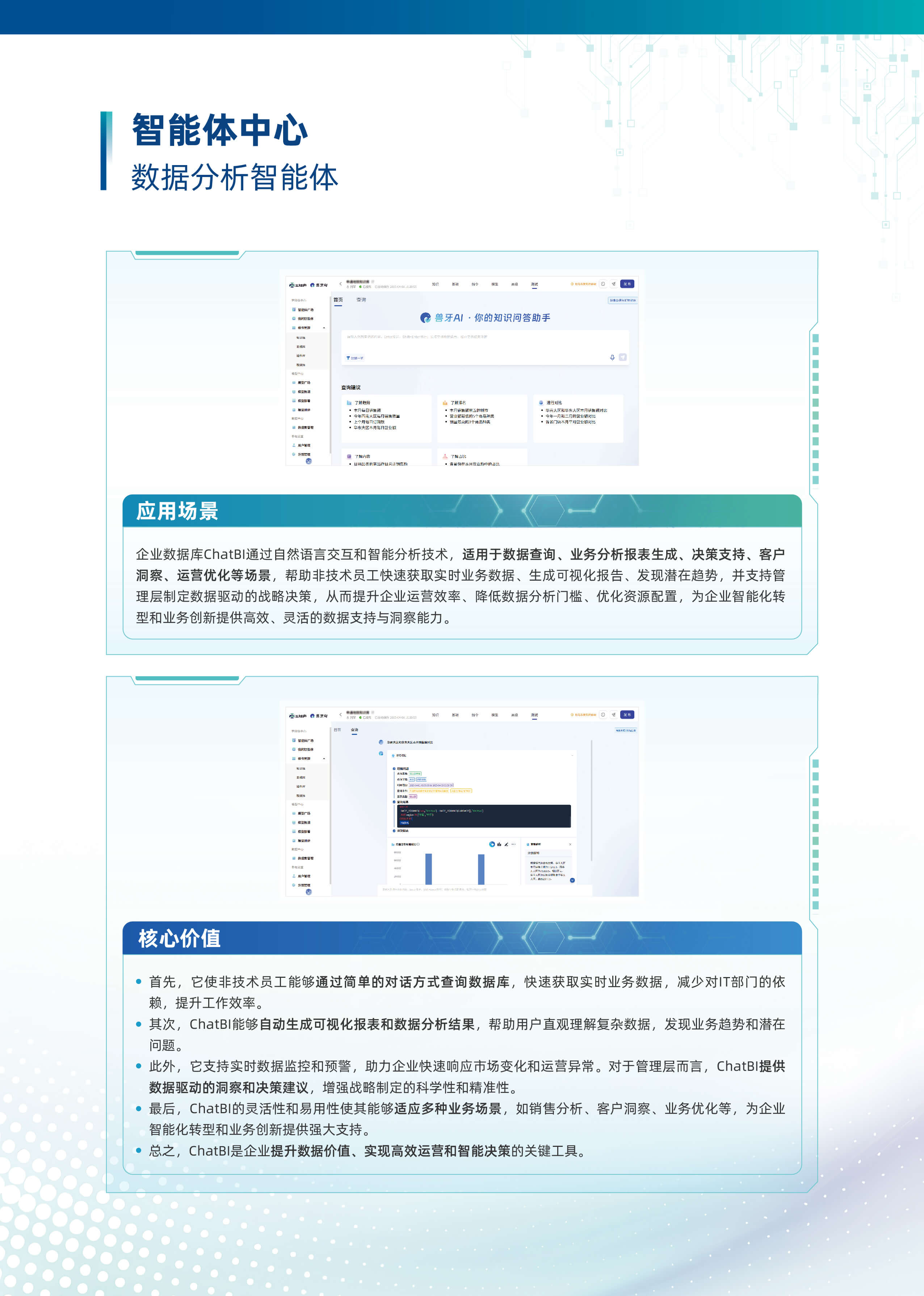 以“行业大模型+场景化智能体”为核心,深度融合多源数据与业务逻辑,构建企业全链路AI数智化基座。平台基于自主可控的行业大模型技术,首创轻量化智能体编排框架,支持外挂知识库、MCP服务、多模态API及数据库的动态调用与协同,实现跨系统数据融合与业务敏捷响应。平台依托行业大模型,创新推出三类智能体。自主规划型智能体可自主灵活调用多渠道多维度数据,实现高效决策。知识问答型智能体凭借精准的问题理解与解析能力,快速响应各类疑问。智能问数型智能体通过自然语言交互,挖掘海量数据价值。