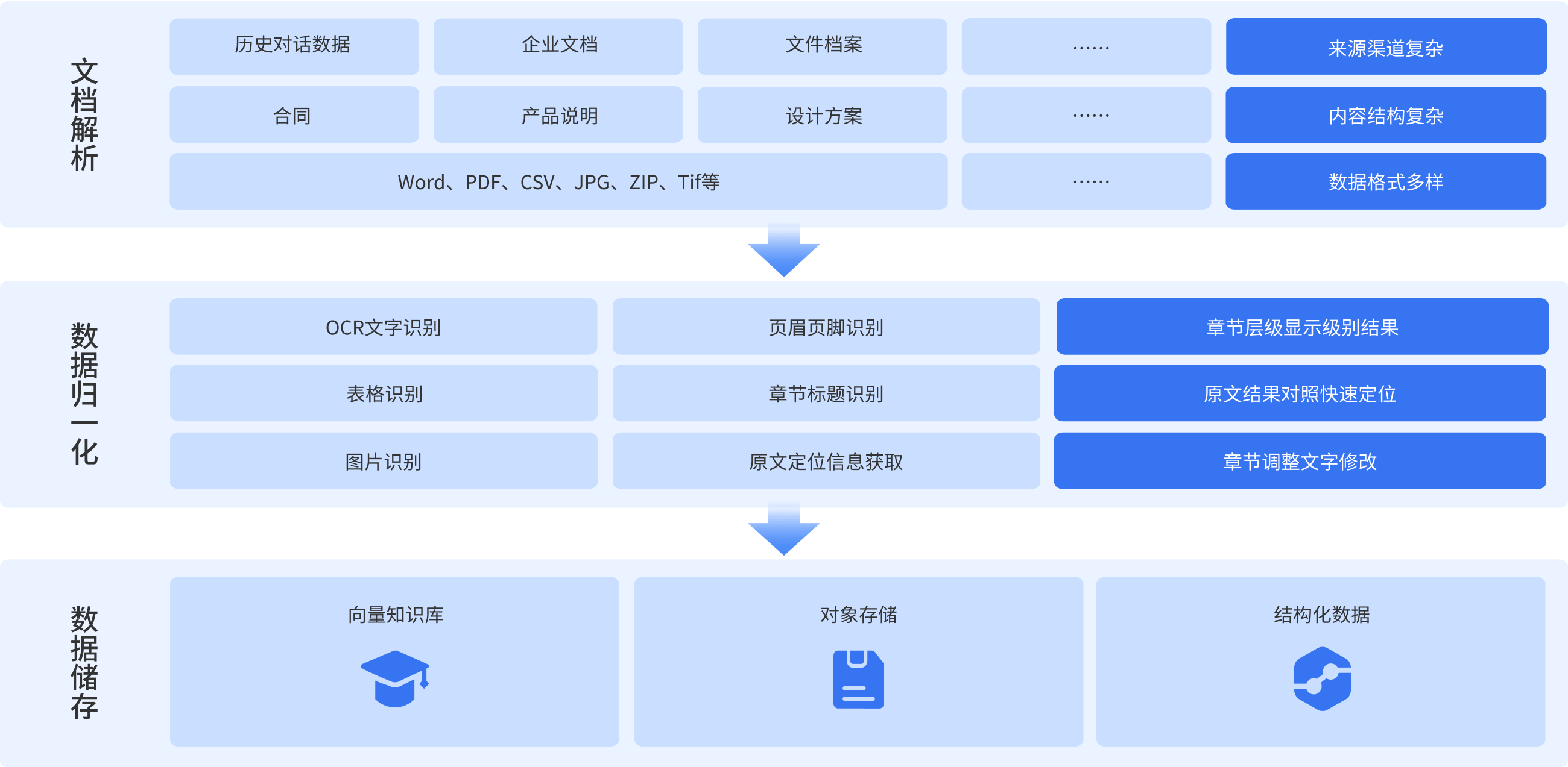 大模型数据治理专为海量知识数据管理而设计的高性能解决方案,为大模型增量化训练及微调训练提供基础输出处理支撑。支持一键解析多源异构数据集,内置AI模型实现文档内逐词句的精准检索、定位及调用,提供高度可扩展的接口,采用多元高精度OCR技术,支持自动解析原文结构及内容。