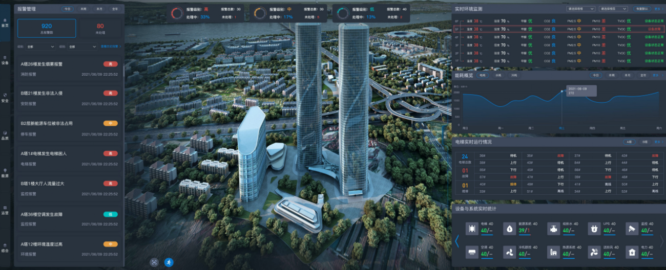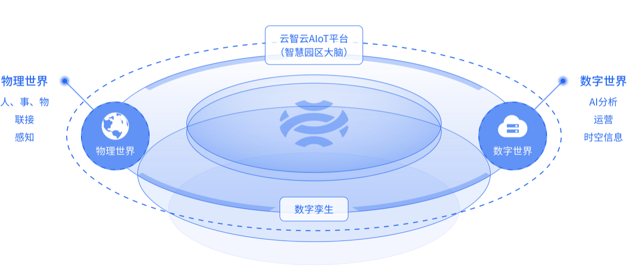 以楼宇建筑全生命周期数据为核心,“云智云 AIoT 平台”为支撑,基于数字孪生的三维技术,将物联网、人工智能、大数据等新 ICT 技术进行整合,建设成新一代科技、高效、安全、绿色、健康的智慧园区,实现园区对外服务的形象提升,对内运营的降本增效